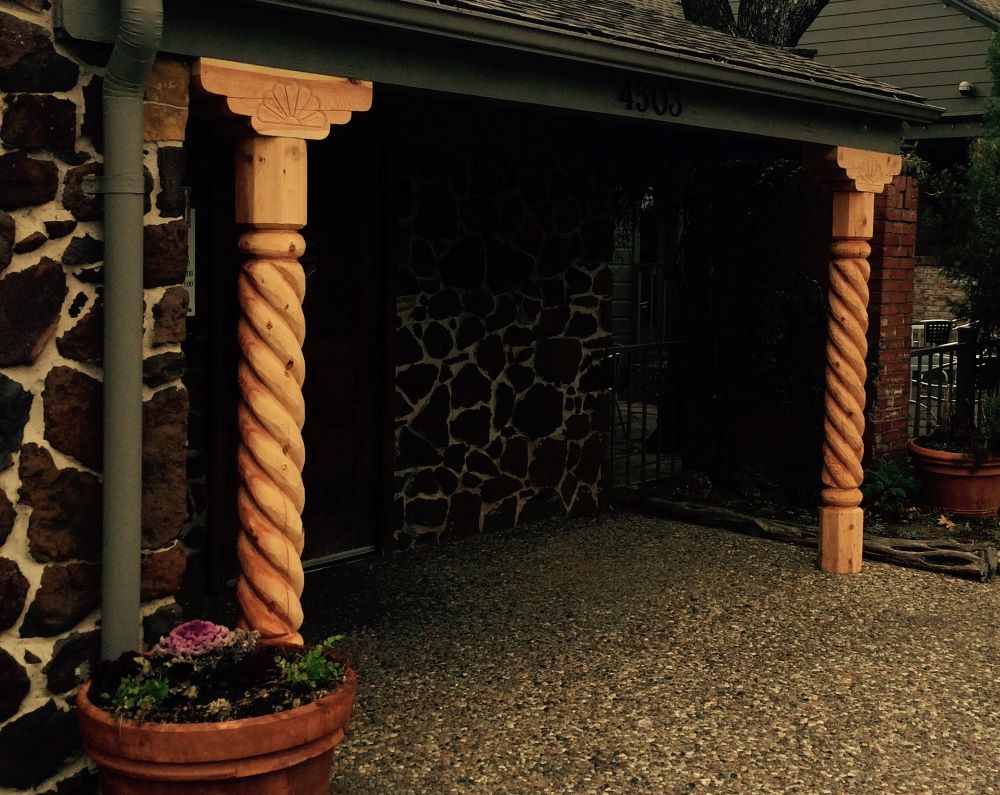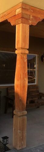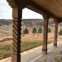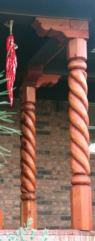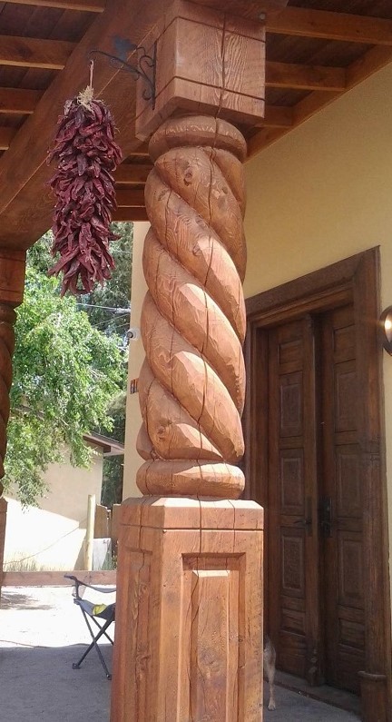 Carved Southwestern Architectural Elements, in local Douglas Fir (material), Spiral Post / Columns, Corbels, Mantels, Sunburst Rosettes, Shelf Brackets.